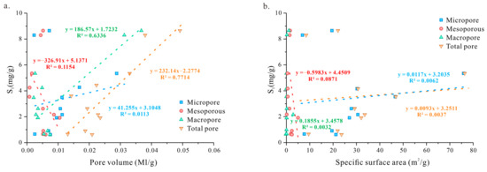 (a) Intersection diagram of pore volume and S1; (b) Intersection diagram of specific surface area and S1.