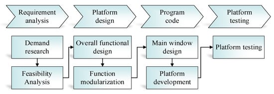 The development process of the platform mainly includes four parts: requirement analysis, platform design, programming, and platform testing. The requirement analysis includes requirement investigation and feasibility analysis before platform development. Based on the results of the requirement analysis, the overall functions of the platform are summarized, and each function is implemented and tested through programming. This is illustrated in Figure 3.