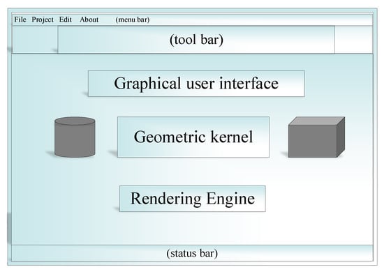 By studying the organizational structure of commercial 3D CAD software, it is concluded that the 3D support platform mainly includes three main components: geometric kernel, rendering engine, and graphic user interface. The main framework is shown in Figure 4. The geometric kernel provides the necessary geometric data structure and modeling algorithms for three-dimensional modeling, including basic primitive generation (such as cubes, spheres, cylinders, etc.), basic operation algorithms (such as extrusion, fitting, Boolean operations, etc.), as well as reading and saving functions for three-dimensional data [], which is the core layer of the 3D platform. The rendering engine primarily renders, displays, and stores loaded or generated three-dimensional geometric modeling data storage formats, serving as the foundation of the platform’s 3D visualization. The graphical user interface is mainly used to implement user-friendly human–machine interaction functions, providing a visual window for the platform, which is the top layer of the 3D platform.