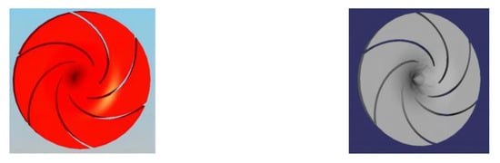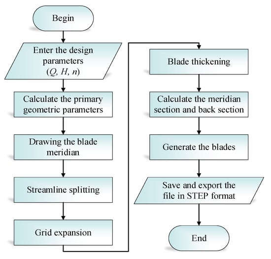 Three-dimensional modeling of centrifugal pump impellers represents a critical aspect of pump design [], as the hydraulic design of impellers has important implications for the efficiency, head, and cavitation of centrifugal pumps []. In the process of impeller design, the primary geometric parameters of the impeller are first calculated based on design parameters. Then, a blade meridian is drawn based on the primary geometric parameters. Once the shape of the blade meridian has been determined, the entire impeller flow path is divided into multiple small channels, with multiple streamline points obtained from these individual channels. The grid expansion method is then used to obtain the blade camber line from these streamline points, followed by the thickening of the blade and retrieval of the blade back line. The blade camber line is then transformed into the blade axis section line, after which the working surface and back surface of the blade are drawn based on the axis section line, and subsequently fitted to generate the blade. The design process is illustrated in Figure 16.