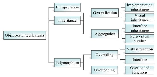 The C++ language [] has evolved from the foundation of the C language and is widely used. It has advantages such as concise syntax, compactness, ease of use, flexibility, high-quality code generation, and fast program execution efficiency. Moreover, it supports both procedural and object-oriented programming paradigms, incorporating features such as encapsulation, inheritance, and polymorphism. Figure 7 provides a detailed description of the fundamental characteristics of object-oriented programming. The underlying source code of the Open CASCADE geometric kernel and Qt graphical user interface library, which involve computationally expensive operations such as graphics rendering and Boolean operations, are predominantly written in C++. Considering these factors, this paper selects C++ as the development language for the platform.