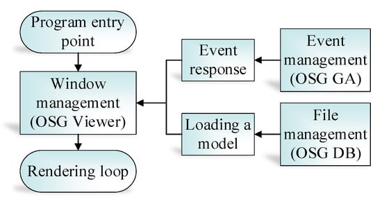 A 3D rendering engine utilizes image processing and computer graphics techniques to convert geometric data into computer-readable image information, which is displayed in a window and provides a collection of application programming interfaces for interactive processing. A 3D graphics engine includes multiple fields such as image processing, human–computer interaction, software programming, computer graphics, etc., and should at least contain two hierarchical layers: the image rendering layer and the data interaction layer. The former provides interfaces for rendering and displaying graphic data, either designed in 3D space or loaded from external sources; the latter offers interaction function interfaces such as 3D model optimization, assembly and control. The visualization components of Open CASCADE are developed based on OpenGL. Compared to other 3D rendering engine platforms such as OpenInventor, Coin3d, OSG, and VTK, the display effect and interactive function are relatively simple. It also cannot fully utilize the GPU hardware acceleration function, resulting in slow loading and rendering speed for 3D graphic files []. Therefore, this platform does not adopt OpenGL as the visualization module. Currently, the outstanding 3D display engines include OpenSceneGraph, Coin3D, and OGRE. Among them, OpenSceneGraph (OSG) is a high-performance open-source 3D rendering engine library based on OSGPL license, mainly applied in modeling, gaming, VR, and scientific visualization fields [].
