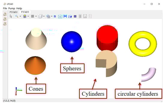 By exploring the geometric kernel algorithms of Open CASCADE and using the MakeBox, MakeCone, MakeSphere, MakeCylinder, and MakeTorus classes provided by the Open CASCADE library, common geometric primitives such as cubes, cones, spheres, cylinders, and circular cylinders were modeled on the established 3D support platform, as illustrated in Figure 14. Additionally, the basic operational algorithms related to 3D modeling of pump designs were investigated and tested, including Fillet, Boolean, and Prism functions, as depicted in Figure 15.