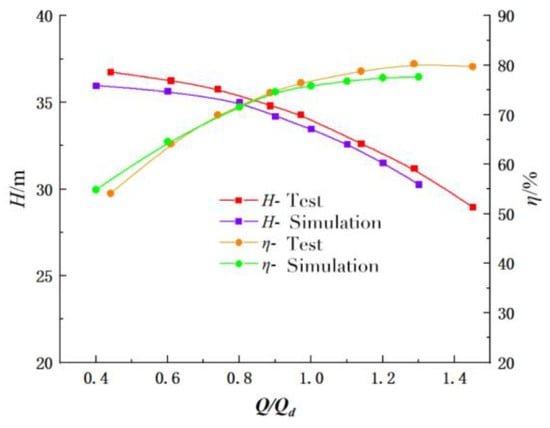 The design target head of the centrifugal pump was 33m. After calculation, the head of the centrifugal pump at the design working condition was 33.47m, which differed from the design target by 1.42%. The designed scheme met the requirements for subsequent numerical simulations. Furthermore, the feasibility of the numerical simulation was verified via energy performance testing experiments on the model pump. The comparison curve between the experimental and simulated results is shown in Figure 23. As can be seen from the figure, at the design working condition, the difference between the design head and the experimental value was 1.56%, and the difference in efficiency was 1.36%. Therefore, at the design working condition, the difference between the simulated and experimental values of the centrifugal pump was small, which suggests that using the 3D platform to design the centrifugal pump is feasible. The accuracy and precision of the design and modeling can meet the requirements of subsequent CFD calculations.