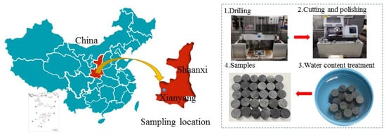 Illustrated in Figure 1, the sample was taken in a mine in the Chinese province of Shaanxi. The XRD analysis revealed that the sample’s main components were quartz (44.9%), clay minerals (28.3%), plagioclase (21.1%), siderite (2.3%), and calcite (1.3%). The collected rock samples were machined into cylindrical specimens with a height of 50 mm and a diameter of 50 mm.