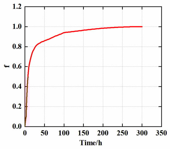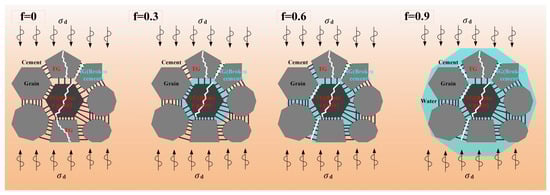 Figure 2 shows the loading process of the test, at the same time, to maintain sample homogeneity as much as possible, when selecting samples for testing, it is important to avoid samples that exhibit prominent macroscopic cracks and voids. Before carrying out the test, we first tested the rock’s natural water absorption properties. Figure 3 indicates that with the addition of soaking time to the rock sample, the rock saturation increases rapidly at first and then tends to be stable. This is due to the fact that rock samples have a finite water absorption rate, and when the rock sample is immersed in water at first, the fractures and pores in the rock open up and the water saturation of the rock initially rises rapidly. As the degree of saturation grows, the pores and cracks of the rock are gradually filled with free water. Therefore, the saturation of the rock sample tends to stabilize as the soaking time rises. In this paper, the relative saturation degree f is employed to depict the saturation of the rock samples. The following is the formula: