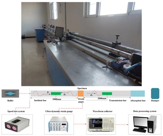 Figure 4 and Table 2 display that the SHPB test system is adopted in this study. The system consists of a bullet launching system, a stress wave conduction system, an energy absorption system, and a data processing system, which can carry out dynamic impact tests on the sandstone with various impact velocities and saturation degrees. When performing this experiment, both ends of the sample were first wiped clean, and the ends of the sample were subsequently greased to minimize contact forces with the rod. After anchoring the sample, the bullet was inserted into the launching rod, fired, and the dynamic load compression test was completed. In addition, to decrease test error, the test was conducted on the bullet in the same position as much as possible. In accordance with the 1D stress wave theory, the sample’s dynamic parameters can be acquired by the following formula [32,33,34], in addition, the strain (t) on the left is the strain of the sandstone sample, and the , , and on the right are the incident strain, reflected strain, and transmitted strain recorded by the improved SHPB.