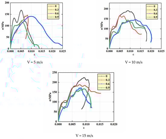 Figure 5 shows the voltage and time evolution curve of typical sandstone. According to the figure, the author selects three kinds of waves to calculate the stress–strain of sandstone. Rock properties undergo changes with varying water content, and the stress–strain curve is a fundamental tool for studying these properties. In this study, stress–strain curves were plotted for rocks subjected to different water content and impact velocities, as depicted in Figure 6. The stress–strain curve exhibits three distinct stages: elastic, plastic, and post-peak. Analysis of Figure 6 reveals a notable influence of water content on the strength of the rock specimens. As water content increases, the peak value of the stress–strain curve decreases. This phenomenon can be attributed to the enhanced interconnectivity of weaker pores and fractures within the rock formation facilitated by increased water content, resulting in a reduction in the peak value of the stress–strain curve.
