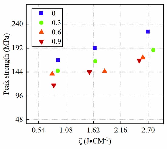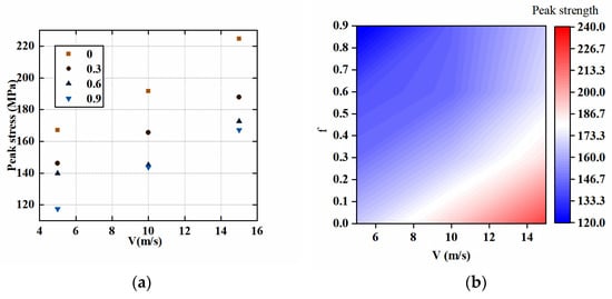 After absorbing water, the particles inside the rock will interact with water in a variety of ways and resulting in a macroscopic difference in rock strength. Therefore, research into the strength characteristics of water-bearing rocks has always become a hot topic in rock mechanics. Many scholars have studied the strength characteristics of water-bearing rocks and found that in most cases, water will weaken the strength of rocks, while some scholars have discovered that water can enhance the strength of rocks [35,36,37]. However, there are few studies on the dynamic strength of the rock at various impact velocities and degrees of saturation. Thus, dynamic impact tests with diverse impact velocities were implemented on rocks with different saturation degrees to further investigated the mechanism of impact of impact velocity and saturation degree on rock strength. The rock’s dynamic strength under different saturation degrees and impact velocities is depicted in Figure 7 and Table 3. As for the cloud map, the color of the cloud image represents the different peak strengths of the sandstone, and the corresponding relationship between the color and the peak strength of the sandstone can be seen in the label on the right. It can be seen from the cloud map that the peak strength of sandstone is proportional to the impact velocity and saturation degree. The rock’s dynamic strength reduces as the saturation of water rises. For example, when the saturation of the rock is 0, 0.3, and 0.6, the rock’s dynamic strength is 167.25 MPa, 146.13 MPa, and 139.89 MPa, respectively. This suggests that water exerts a strong effect on the strength of the sandstone. Furthermore, the rock’s dynamic strength enhances with the rise in impact velocity. As an example, the rock’s dynamic strength is 167.25, 191.62, and 224.62 MPa for impact velocities of 5 m/s, 10 m/s, and 15 m/s, separately.