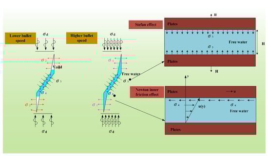 The presence of free water in rock formations has a decelerating effect on crack propagation at higher velocities. Figure 9 illustrates three primary factors contributing to this phenomenon: σ1, induced stress from the meniscus effect. At lower bullet velocities, as shown in Figure 9, free water is unable to reach the crack tip, resulting in the formation of σ1. σ2 represents stress caused by the Stefan effect, while σ3 represents stress arising from Newtonian internal friction. At higher bullet velocities, the inertia of free water becomes a significant contributor to the formation of σ3. Moreover, the movement of water molecules generates a tensile stress σ4 at the crack tip, denoted as h. Notably, at higher impact velocities, the effects of σ3 and σ4 become more pronounced.