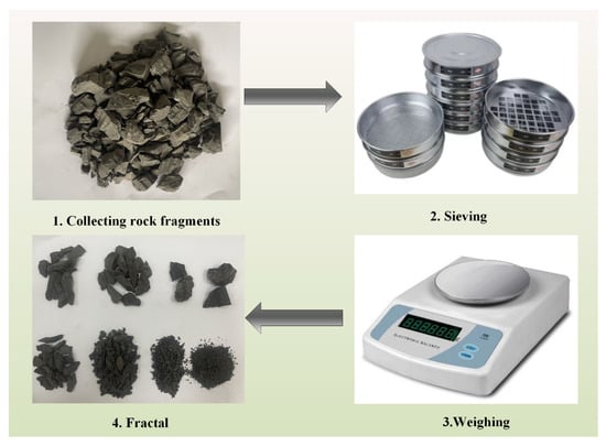 In the equation, dx represents the size of an individual particle, dm refers to the maximum size of the sample fragment, Mt represents the total mass of the sample after crushing, Mx denotes the cumulative mass of the fragments with sizes smaller than dx, and D represents the fractal dimension of the fragment size distribution in the sample.