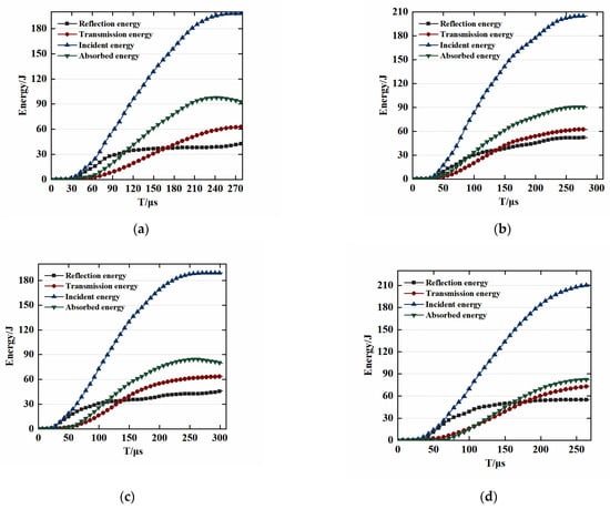 Calculations are made to determine the energy value and energy proportion of different water-content sandstones to explore the impacts of water content and bullet velocity on the energy conversion mechanism of sandstone. Figure 13 and Table 4 show energy values for the sandstone with diverse water content. The energy conversion of sandstone is significantly influenced by bullet velocity. Each sandstone energy value rises in line with an increase in bullet velocity. In addition, Figure 14 shows the sandstone’s energy evolution curve. The figure shows the energy conversion mechanism of rocks with significant water content. According to this figure, the water content affects little the incident energy of the sandstone, while it strongly affects other energy values. In addition, the incident energy of sandstone is significantly different with different bullet velocities. Therefore, the author studies the relationship between reflected, absorbed, and transmitted energy of the sandstone under the influence of varying incident energy from the point of view of incident energy. Figure 15 presents that with rising incident energy, the reflected, absorbed, and transmitted energy of the sandstone also increases. Moreover, energy dissipation density is typically employed to describe the character of energy dissipation. Hence, this paper explores the evolution of the energy dissipation density of sandstone under water content and impact velocity. The figure shows that the water content has little influence on energy dissipation density, whereas bullet velocity has a significant influence on energy dissipation density. The velocity of the bullet is positively associated with the energy dissipation density. Moreover, the bullet’s velocity is proportional to the rock’s incident energy. This may be due to the fact that as the bullet’s velocity increases, the incident strain of the rock also increases, and thus its incident energy increases.