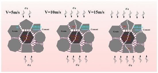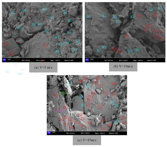 The SEM images reveal notable variations with increasing bullet velocity. As illustrated in Figure 20 and Figure 21, lower bullet velocities predominantly exhibit along grain fractures within the rock’s internal particles, accompanied by secondary trans-grain fractures. In contrast, higher bullet velocities demonstrate a shift towards trans-grain fractures as the primary mode, while along grain fractures assume a secondary role. It is worth noting that along grain fractures occur along crystal boundaries, resulting in crystal fracture, while trans-grain fractures transpire within the crystal structure itself. Notably, along grain fractures consume less energy due to their occurrence along crystal boundaries, whereas trans-grain fractures require more energy within the crystal structure. Consequently, rocks exhibit lower strength under along grain fractures and higher strength under trans-grain fractures at the macroscopic level. Thus, a microscopic analysis has been conducted to elucidate the strength mechanism of rocks under the coupled effects of dynamic loading and water.