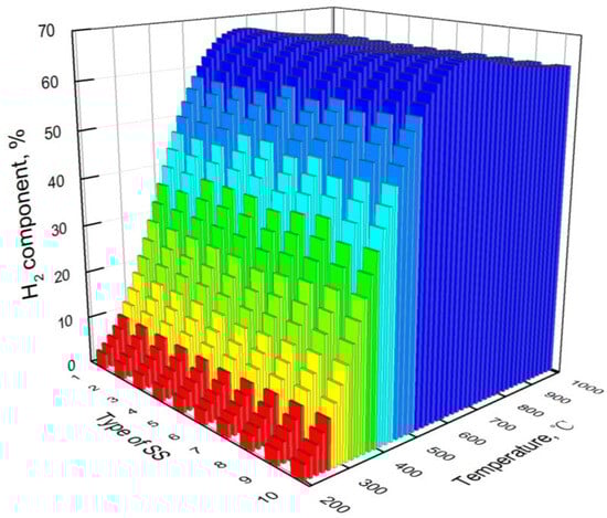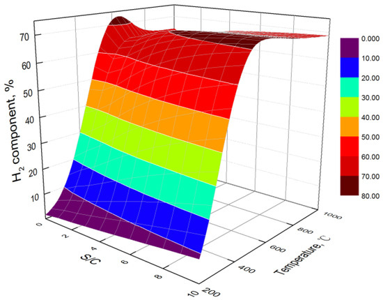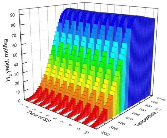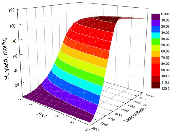 The effects of S/C on the hydrogen yield are also shown in Figure 1. Figure 1 shows that the hydrogen yield increases with the increase in S/C. Taking the temperature of 706 °C as an example, the hydrogen yield increases from 36.08 mol/kg to 113.67 mol/kg as the S/C increases from 0 to 10. With the increase in S/C, SRR (Equations (2)–(7)), WGR (Equation (10)), and WGSR (Equation (11)) shift to the right, and MR (Equation (8)) and RMG (Equations (15), (18), (21) and (24)) shift to the left, increasing the hydrogen yield. The characterizations of bio-oil steam reforming for hydrogen production have been investigated via fixed-bed experiments [38]. The results implied that the hydrogen yield increased with the increase in S/C. These results are consistent with the findings in this study.