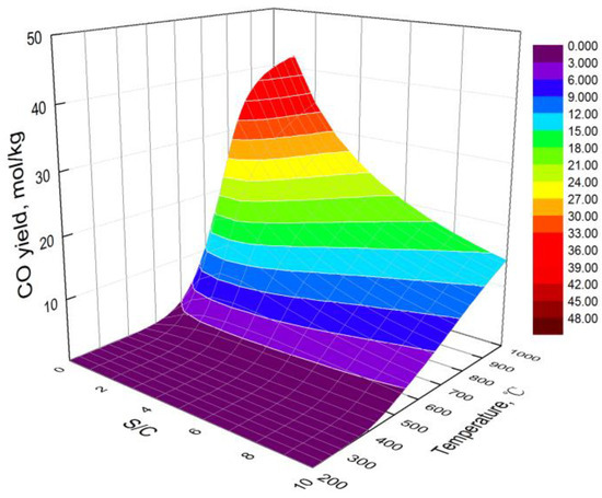 The effects of S/C on the carbon monoxide yield are shown in the Figure 2. Figure 2 shows that, at low temperatures (lower than 412 °C), the carbon monoxide yield increases with the increase in S/C. At low temperatures, MR (Equation (8)) and WGR (Equation (10)) are the main factors that affect the carbon monoxide yield and they shift to the left, increasing the carbon monoxide yield. However, at high temperatures (higher than 412 °C), the carbon monoxide yield increases first and then decreases with the increase in S/C. At high temperatures and low S/C, MR (Equation (8)) and WGR (Equation (10)) are the main factors that affect the carbon monoxide yield and they shift to the left, increasing the carbon monoxide yield. However, at high temperatures and high S/C, WGSR (Equation (11)) is the main factor affecting the carbon monoxide yield and it shifts to the right, decreasing the carbon monoxide yield.