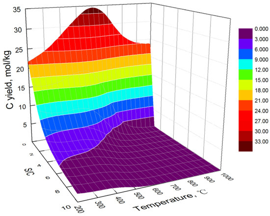 The effects of S/C on the carbon yield are also shown in Figure 4. As shown in Figure 4, the carbon yield decreases with the increase in S/C. Taking the temperature of 690 °C as an example, the hydrogen yield increases from 32.41 mol/kg to 0.02 mol/kg with the increase in S/C from 0 to 10. WGR (Equation (7)) is the main factor that affects the carbon yield and shifts to the right with the increase in S/C, decreasing the carbon yield.