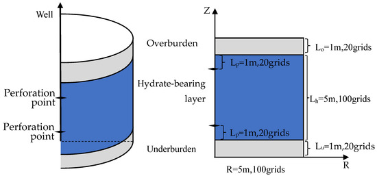 A two-dimensional radially symmetric reservoir containing natural-gas hydrate is considered (Figure 1). The upper and lower cover layers, defined as the overburden and underburden of the reservoir are non-permeable cover layers, and there is heat exchange between the reservoir and cover layers. A straight well is set in the center of the model for heat injection and gas production, and a perforation point is set close to the bottom of the well.