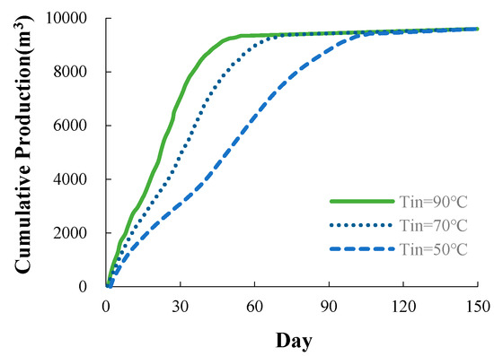 Cumulative production reached a maximum after 63 days when the heat-injection temperature was 90 °C; this was the fastest of the three different injection temperatures. Cumulative production reached a maximum after 78 days when the heat-injection temperature was 70 °C, and cumulative production reached a maximum after 117 days when the heat-injection temperature was 50 °C.