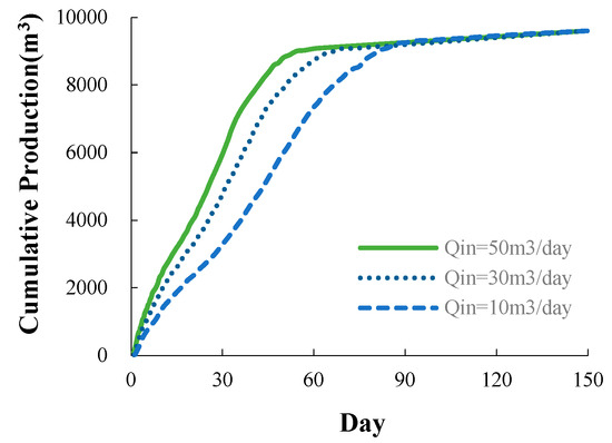 The final cumulative production was approximately equivalent for different heat-injection temperatures with a constant heat-injection rate of 50 m3/day, as there was sufficient injection heat to ensure complete decomposition of hydrates. Cumulative production reached a maximum of about 9600 m3 as the final cumulative production for different heat-injection temperatures (Figure 3).