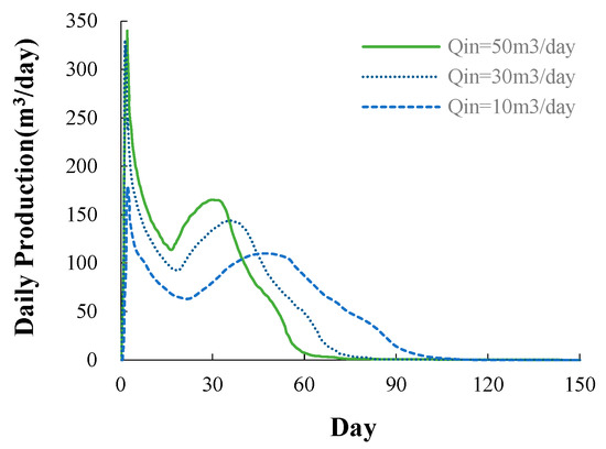 Daily production for different heat-injection rates with a constant heat-injection temperature of 90 °C showed similar variation patterns on the whole (Figure 6), with daily production rising rapidly to a peak at the beginning, gradually decreasing to a certain value, then showing a certain magnitude of increase, and then decreasing slowly until the final daily gas production was 0 m3/day.
