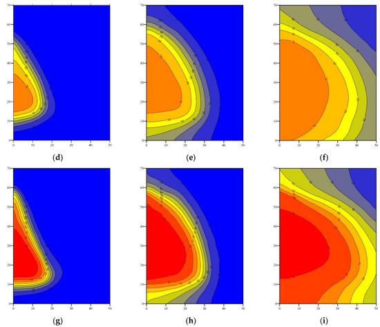 Temperature distribution for different heat-injection rates. (a) Qin = 10 m3/day after 2 days; (b) Qin = 10 m3/day after 10 days; (c) Qin = 10 m3/day after 50 days; (d) Qin = 30 m3/day after 2 days; (e) Qin = 30 m3/day after 10 days; (f) Qin = 30 m3/day after 50 days; (g) Qin = 50 m3/day after 2 days; (h) Qin = 50 m3/day after 10 days; (i) Qin = 50 m3/day after 50 days.