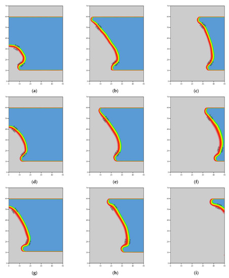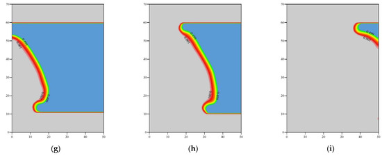 Saturation distribution for different heat-injection rates. (a) Qin = 10 m3/day after 2 days; (b) Qin = 10 m3/day after 10 days; (c) Qin = 10 m3/day after 50 days; (d) Qin = 30 m3/day after 2 days; (e) Qin = 30 m3/day after 10 days; (f) Qin = 30 m3/day after 50 days; (g) Qin = 50 m3/day after 2 days; (h) Qin = 50 m3/day after 10 days; (i) Qin = 50 m3/day after 50 days.