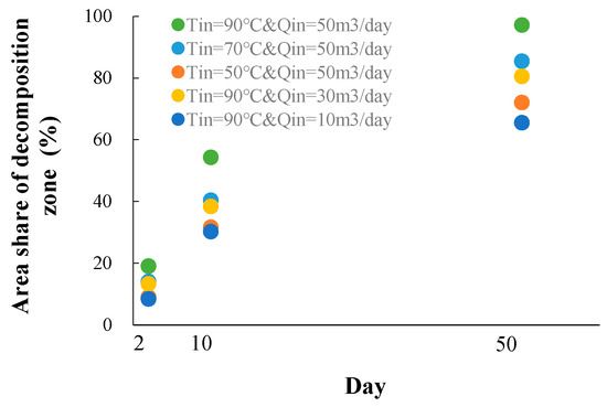 Area share of decomposition zone for different heat-injection rates.