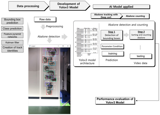 The first step is data preparation. In this step, datasets with annotated images containing abalone instances are gathered from video data. For building training model, YOLOv3 is set to use TensorFlow. Training is carried out using annotated abalone data. The training process involves feeding the annotated images and their corresponding bounding box annotations into the model, and optimizing the model parameters to accurately detect abalone objects. After training, the performance of YOLOv3 model is evaluated by the separate test set. This step helps in assessing the accuracy and generalization capabilities of developed trained model. In the next step, DeepSORT is integrated. DeepSORT is a tracking algorithm used in conjunction with YOLOv3 to track abalone objects across multiple frames. DeepSORT is integrated with YOLOv3 model to associate bounding box detections across frames and track abalone instances over time. The tracking is performed by applying the combined YOLOv3-DeepSORT model on a video or sequence of image frames containing abalone. The model will detect and track abalone instances, assigning unique IDs to each abalone instance to count, and monitor their movements. The number of unique abalone instances is counted based on their tracked IDs. Each ID represents a distinct abalone object. Summing up the unique IDs will give the count of abalone in the video or sequence of frames.