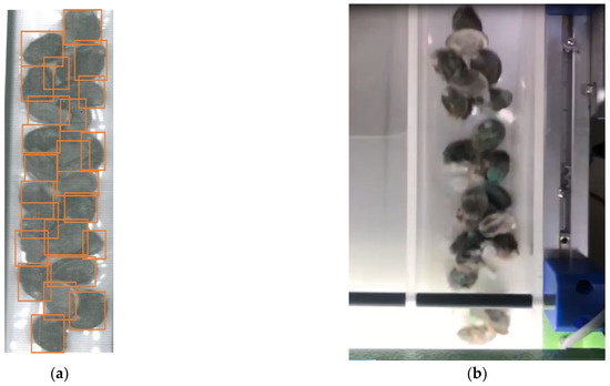 In the second row of Table 2, ‘15’ represents the number of object class for abalone, 0.504950 as the height, 0.729167 as the width, 0.128713 as the x-coordinate (center value), and (0.030556) as the y-coordinate (center value). The orange box on the left side of Figure 4 (a) shows the bounding box for each abalone and (b) show and example of frame in the video data. In the image, each abalone has its own bounding box, and the size and center information are recorded in YOLO format.