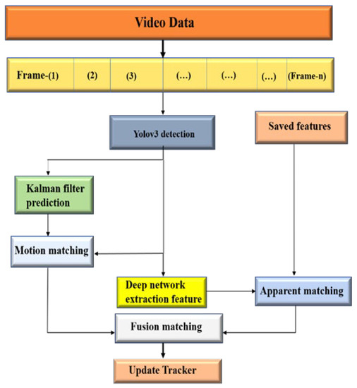 DeepSORT is a computer vision tracking technique that tracks objects while assigning an ID to each one in a frame. DeepSORT incorporates deep learning into a SORT algorithm by including an appearance descriptor to decrease the number of identity swaps of objects in frames, making tracking more efficient. In the object-estimation step, the detections from one frame to the next use a constant-velocity model to estimate the target’s position in the following frame. When a detection is associated with a target, the detected bounding box is used to update the target state, and the velocity components are addressed using the Kalman filter algorithm [46].