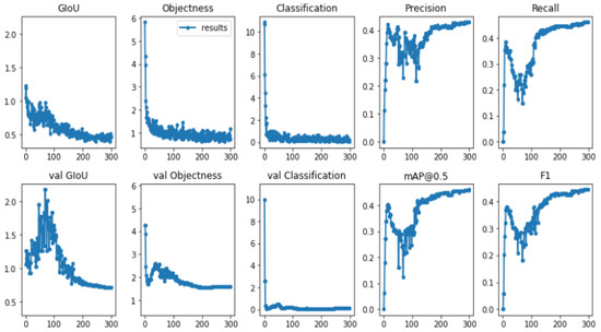 The performance evaluation graphs for precision, classification, objectness loss, F1 score, recall, and mean average precision (mAP) of the training and validation sets are shown in Figure 7. Figure 7 shows three basic types of loss: categorization, objectness, and GIoU loss (Generalized Intersection of Union). The ideal bounding box regression loss is represented by the GIoU loss. The reduced bounding regression loss indicates that accuracy improves consistently [45]. Objectness loss is a measure of the likelihood that an object exists in a suggested region of interest. If objectivity is high, an object is probably present in the image. Classification loss indicates the effectiveness of an algorithm in predicting the proper class of a given object. Therefore, the lower the GIoU, objectness, and classification, the higher the mAP and F1 scores from the model.