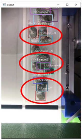 Although Park et al. [3] and Abdelwahab [30] showed promising results, our proposed approach can show improvements in these results by using YOLOv3 (Figure 6) for abalone detection and a robust DeepSORT model for tracking the detected abalones. The method proposed by Park et al. [3] has already been shown to be useful in the problem of counting abalones using the LabVIEW approach, and the study conducted by Abdelwahab obtained promising results from counting people. These approaches are similar to that used in this study.