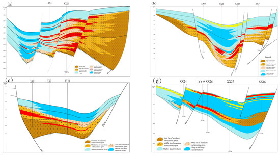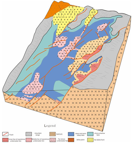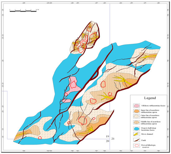 For lithologic reservoirs and structural–lithologic reservoirs of the Nantun Formation of Tanan sag, sandbodies are mostly developed in places such as nearshore subaqueous middle-fan, distal subaqueous fan, fan-delta front, and delta front, which are controlled by boundary faults and sag-controlled faults (Figure 4). Rock types are mainly glutenite, fine sandstone, and siltstone. It has been found through exploration and development that the sandbody distribution is controlled by sedimentary facies. Lithologic sandbodies are developed with good hydrocarbon potential in places such as the nearshore subaqueous middle-fan of steep slope zones, the fan-delta front of gental slope zones, and the delta front, followed by nearshore outer-fan and distal subaqueous fan (Table 2).
