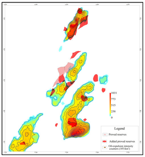 Overlay maps of the oil-expulsion intensity and oil-bearing area (1P) in the Nantun Formation of Tanan sag.
