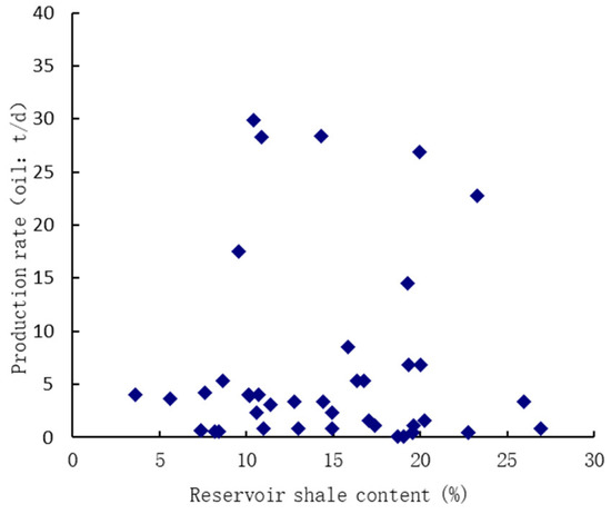 The Nantun Formation of Tanan sag mainly formed in the early–middle peak period of rifting; nearshore subaqeous fans are the major sedimentary system in this area, dominating by turbidite deposit. Thus, reservoirs are poorly situated with relatively high shale contents. Figure 11 depicts an average shale content histogram of reservoirs in the lowstand of the north trough of east/west subsag of the Nantun Formation. The overall shale content in reservoirs of the Nantun Formation of Tanan sag is relatively high, with an average value of 32.8%. Large-scale conglomerates are developed in lowstand sandbodies in the north trough of west subsag, with relatively low shale contents of 20% on average, which is main reason for the subsag-wide oil-bearing capability in this area. However, in east subsag where source rock and reservoir bed are both developed, high shale contents may result in water sensitivity during fracture treatment, and ultimately cause difficulties in production. Figure 12 shows the relationship between shale content and reservoir output in the Nantun Formation of Tanan sag. When the production rate is over 5 t/d, there is a negative relationship between the production rate and shale content, which indicates that reservoir output is strongly constrained by the shale content.