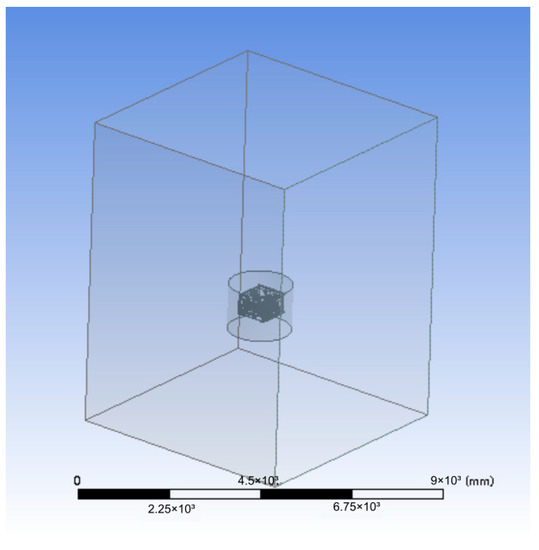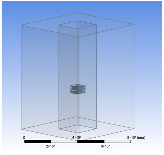 Figure 3In this paper, the simulated fluid domain is divided into two parts: the outer fluid domain and the inner fluid domain. In general, the model size of the fluid domain should be more than three times that of the ROV to reduce the impact of the wall. The size of the ROV in this paper is 800 mm × 750 mm × 600 mm (length × width × height), and the size of the external fluid domain is defined as 6000 mm × 6000 mm × 8000 mm. The initial ROV position is 3000 mm away from the bottom of the outer fluid domain. The cuboid structure with a fluid domain of 2000 mm × 2000 mm × 8000 mm and set in the linear motion simulation is shown in