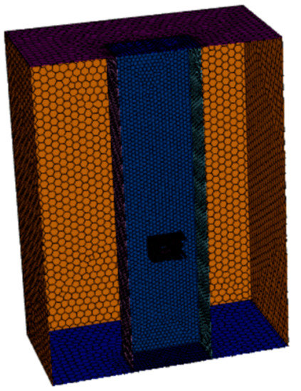 Next, the model was meshed, and polyhedral meshes are used in this paper. The number of grids will affect the simulation results. Insufficient grids will lead to distortion of the calculation results, while excessive grids will slow down the calculation speed but have little impact on the calculation results. Other papers have verified the grid number independence of ROV fluid simulation, and it can be concluded that when the number of grids reaches more than 1 million, the impact on the calculation results can be ignored. In this study, the method of mixed mesh division was used to encrypt the internal fluid domain, and the size of the encrypted mesh was set to 0.001 m. After encryption, the number of mesh in the snorkeling direct motion simulation fluid domain was 2,811,957, and the number of mesh in the turning and rotating simulation fluid domain was 2,794,722 [