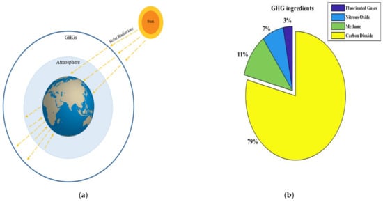 By and large, anthropogenic activities, headed by burning fossil fuels, are causing an increase in carbon dioxide (CO2) concentration in the atmosphere. CO2, like other greenhouse gases, absorbs long-wave radiation from the Earth. Consequently, when there is an increase in the concentration of these gases, it results in the trapping of heat waves and leads to an increase in the temperature of the earth [4]. To put it simply, this process is illustrated in Figure 1a.