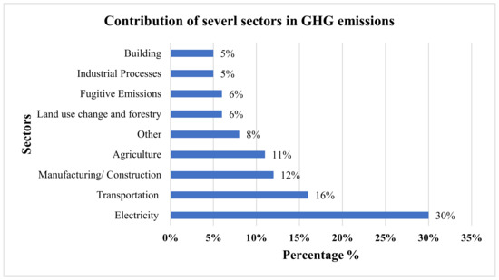 According to the Intergovernmental Panel on Climate Change (IPCC) Working Group III (WG3), global GHG emissions sources are typically categorized into several sectors such as energy systems, industry, buildings, transport, and AFOLU (agriculture, forestry, and other land uses) [9]. In more detail, the contribution of each sector is clarified in Figure 2 [10].