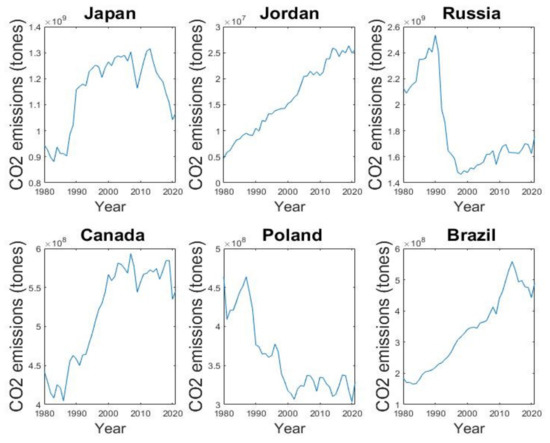 The burning and use of fossil fuels for energy and transportation have resulted in the release of large amounts of carbon dioxide and methane, significant contributors to greenhouse gases. The increasing emissions from fossil fuels have also led to a rise in average global temperatures of 1.1 °C since preindustrial times. The Intergovernmental Panel on Climate Change has stated that immediate action is necessary to limit global warming to 1.5 °C and prevent severe consequences [13]. Accordingly, based on Figure 2, it can be noticed that electricity contributes to GHG emissions has the largest percentage. Hence, it is necessary to encourage and promote electricity generation from other clean sources. CO2 emissions due to fossil fuel burning are the major cause of climate change human-induced. Over long periods, these emissions have either risen or lowered over timescales in several countries, Figure 3 depicts several scenarios where in some countries, the emissions were tackled and reduced, while in other countries, the CO2 emissions are increasing continuously, and in the rest of countries, the CO2 emissions were reduced then risen again [14,15].