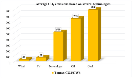 It is worth mentioning that even renewable energy technologies emit some CO2 that is ignorable when compared with fossil fuel. Figure 5 compares the amount of CO2 emissions from using several types of energy sources, renewable and non-renewable [48]. In other words, renewable energy sources are not totally CO2 free. Based on Figure 5, it is unequivocal that coal is the worst energy source from CO2 emissions aspect as it emits an immense amount of tCO2 per GWh, followed by oil, which stands between coal and natural gas, with a difference of only 153 tCO2 per GWh lower than that of the coal.