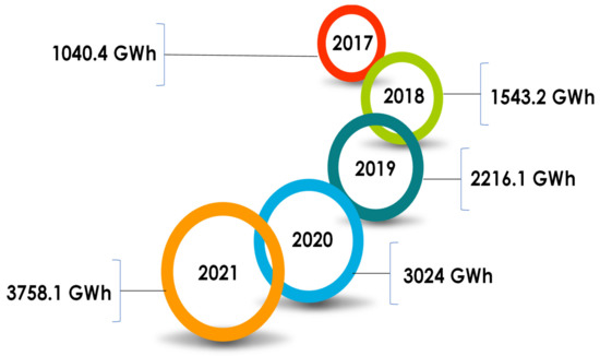 Thus, it is, hitherto, vulnerable and exposed to the fluctuation in global energy prices. The booming of solar and wind energy projects in Jordan can be visualized by understanding the amount of electrical energy purchased by these two renewable sources in Jordan (GWh), as prominent in Figure 6 [49]. Consequently, Jordan made significant efforts to tackle the aforementioned issue, summarized by establishing several RE projects where the contribution of the wind and solar PV projects, combined, in terms of the electrical energy purchased from these two sources, are clarified in Figure 6. In contrast, Figure 7 represents the separate contribution of each type from 2017 to 2021. However, several renewable energy projects were constructed in Jordan, as clarified in Figure 8, in conjunction with their corresponding AC capacities [11,50,51], which is the springboard of this research, and it is worthy to mention that these listed projects are the most known ones in Jordan.