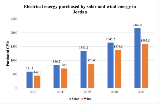 Detailed electrical energy purchased by solar and wind energy in Jordan (GWh).