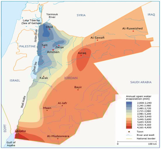 The scarcity of water resources is the ultimate challenge that is met nowadays in Jordan since, based on per capita, the assigned quantity of water indicates that Jordan owns the lowest level of water resources globally. Although a few surface water resources are present in Jordan, collectable rain is the major source of water [54]. Unfortunately, the evaporation rate in Jordan, which is clarified in Figure 9, is relatively high, and this decimates water resources [55].