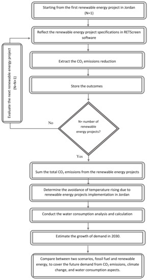 These steps can be summarized by estimating the amounts of CO2 reduced due to generating electricity from wind and PV technologies since, as mentioned before, the CO2 emissions from RE projects are much lower than that of fossil fuel sources. The estimation of CO2 reduction has been carried out with the aid of RETScreen software, as clarified in the following subsection. Afterwards, estimate the temperature is avoided by dint of the mentioned RE projects. The penultimate step is to discuss how these projects contribute to reducing water consumption as they do not require a cooling phase. Finally, the demand in 2030 will certainly increase due to the population increase, and the growth in demand will be assumed to be covered by the RE projects, keeping in mind that the existing traditional power plants will still work in parallel with the RE projects.