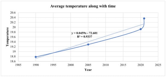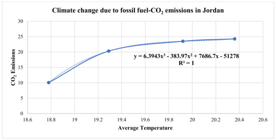 Similarly, Equation (4) links the average temperature in Jordan along with the years to estimate the amount of the expected temperature in the future. As mentioned before, the high R2 value suggests a strong correlation between the variables, allowing for accurate predictions and further analysis of the relationship.