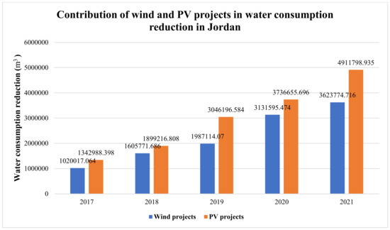 However, regarding the water consumption reduction, it is mentioned how covering the growth in demand by the renewable energy projects in Jordan affects the water consumption situation in Jordan. As mentioned in the previous section, the difference in demand between 2030 and 2021 equals 10,849.83 GWh. If this growth is decided to be covered by natural gas, the most used one in Jordan, an amount of water for cooling purposes will be required that is equal to 6.5 × 109 gallons, while neither in the wind nor in PV technologies, the water will be required. In other words, the amount of saved water will likely be 6.5 × 109 gallons if generating electricity from natural gas is replaced by wind or PV projects.