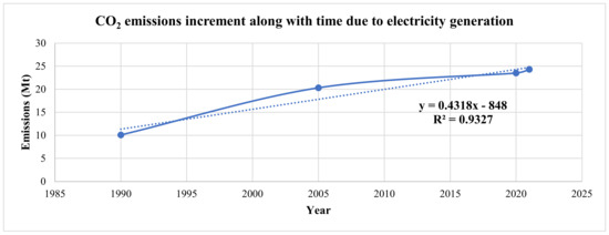 Hence, with the absence of renewable energy projects, the emitted amount of CO2 in 2030 will be 28.554 Mt + 19.033885438 Mt = 47.587885438 Mt. Accordingly, based on Equation (2), the temperature would be 21.623 °C, but based on Figure 19 that also has been plotted based on Table 4 the temperature in 2030 is expected to be 20.576 °C, which means that if the growth in demand in 2030 is covered by implementing some new renewable energy project in conjunction with the already existing renewable energy projects, an amount of temperature increasing avoidance in 2030 will be equal to 1.047 °C in that year.