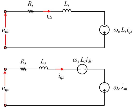 where are the stator voltage and current in the d-axis and q-axis, respectively, is the stator resistance, p is the derivative term, are the d-axis and q-axis flux linkages, and is the electrical rotating speed. The -axis stator flux linkage equations are