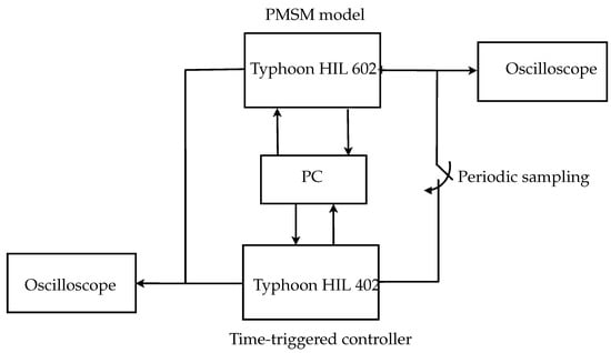 This section validates the proposed hybrid control techniques (HCTs) for the PMSM used in EVs, using two methods. The first method is based on the MATLAB/Simulink Toolbox while the second one depends on using the Typhoon HIL real-time power electronics emulator. During the Typhoon validations, there are two different typhoons used. The first one, Typhoon HIL 602+, is used for implementing the PMSM with the lowest acceptable sample time of 10 s. The second one, Typhoon HIL 402, is used for applying the control techniques, where the designed sample time of 100 s is used. Figure 3 below shows a block diagram of the considered HIL setup for validation.